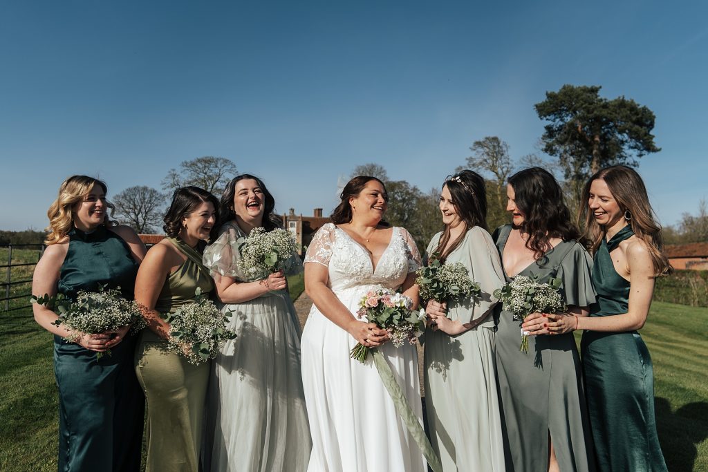 The couple chose a beautifully understated colour palette of spring greens, soft whites, and gentle neutrals. It created an atmosphere that felt timeless and natural — effortlessly elegant without ever feeling over-styled. The barn was dressed with simple florals and foliage, perfectly mirroring the countryside surroundings, while the bridesmaids’ dresses and table details echoed the same soft, romantic tones.